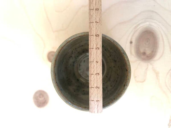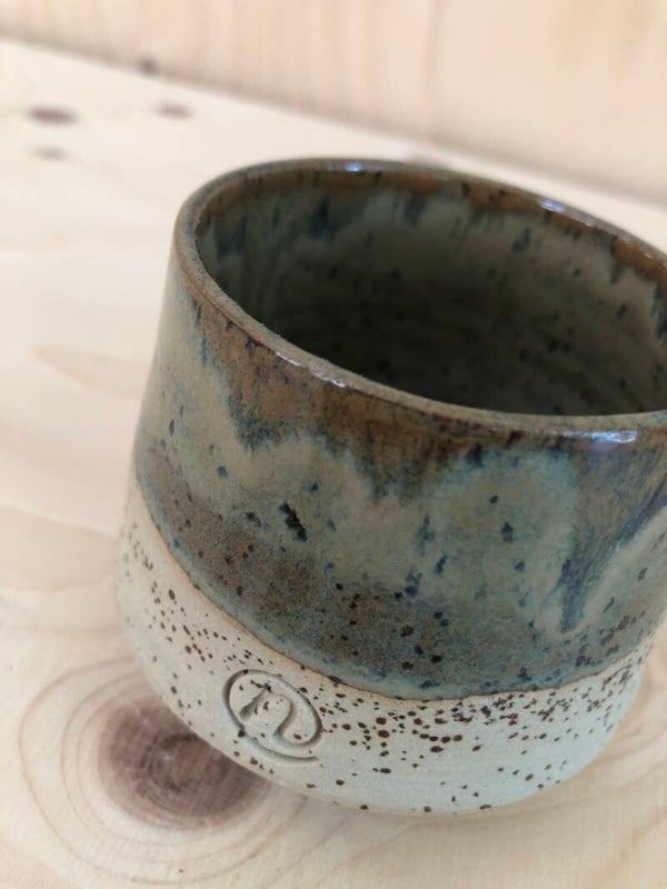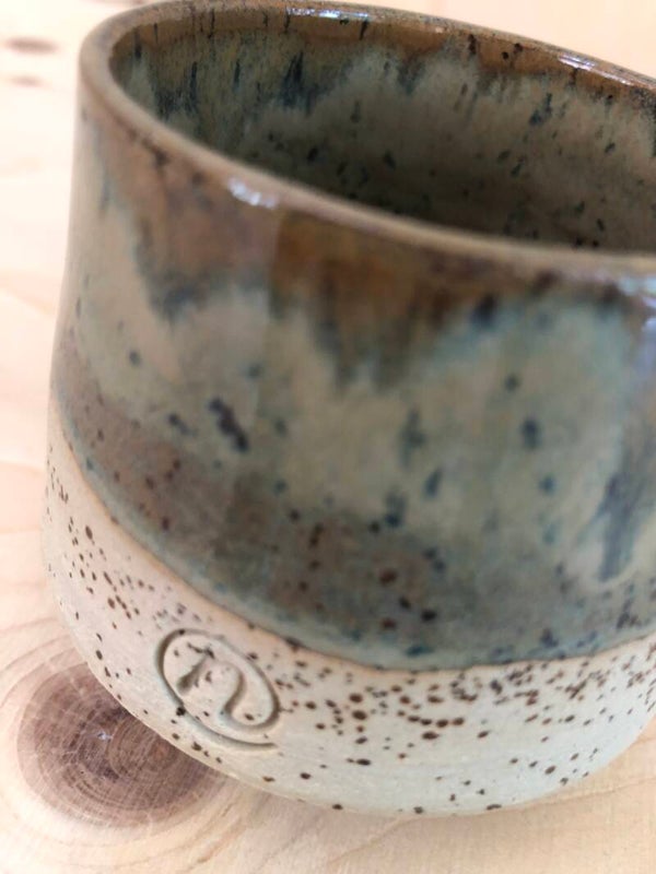 De gespikkelde mok is groen/bruin geglazuurd. De buitenkant is deels geglazuurd.