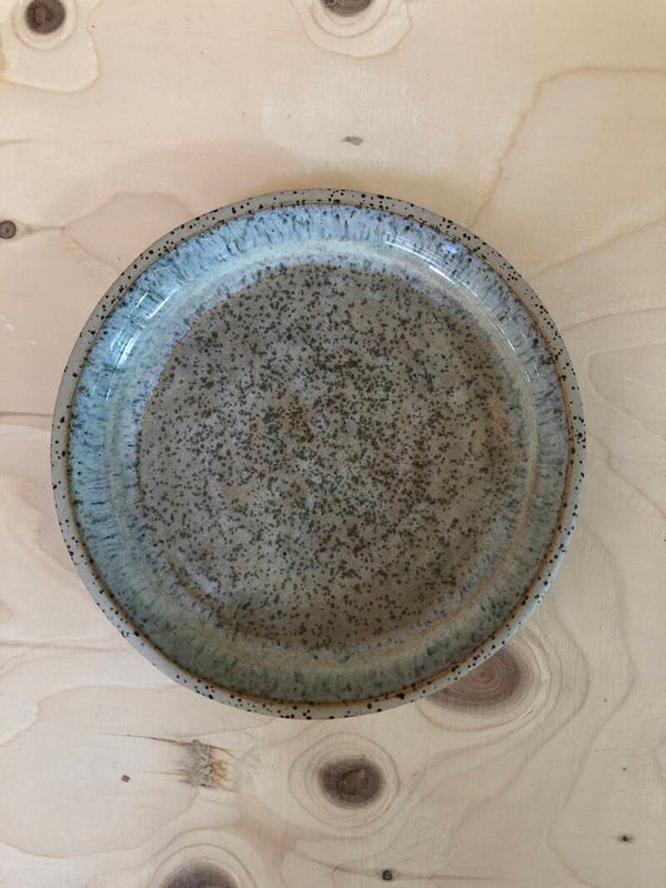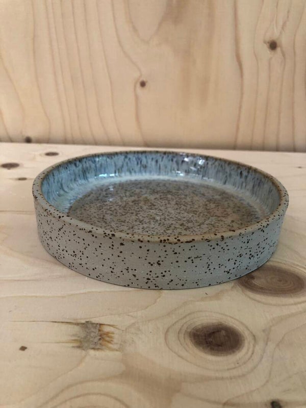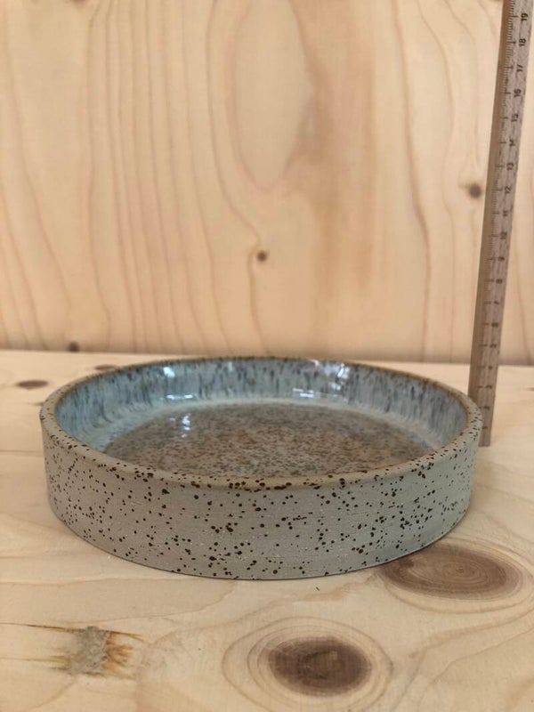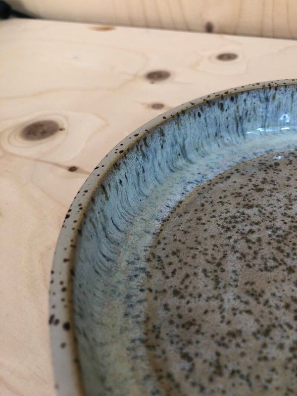 Deze schaal van spikkelklei is geglazuurd met een honingkleurig en crèmekleurig/blauwig glazuur. De buitenkant is niet geglazuurd.