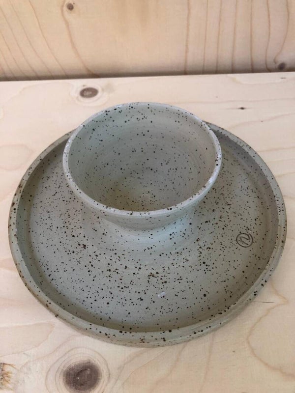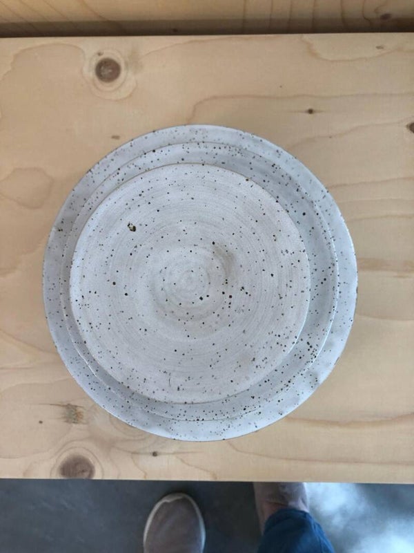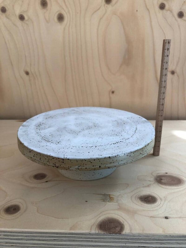 Dit taartplateau is uit één stuk spikkelklei gedraaid. Alleen de bovenkant is geglazuurd met een wit, mat glazuur waar de spikkels doorheen komen.