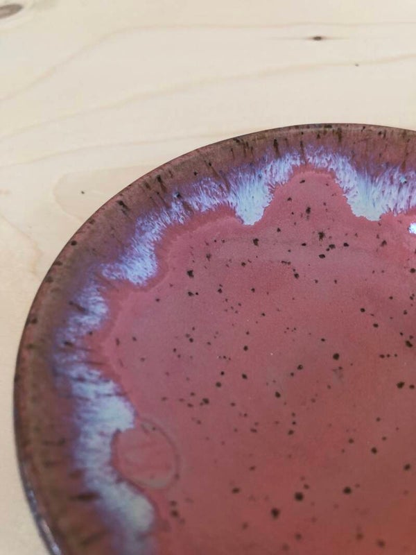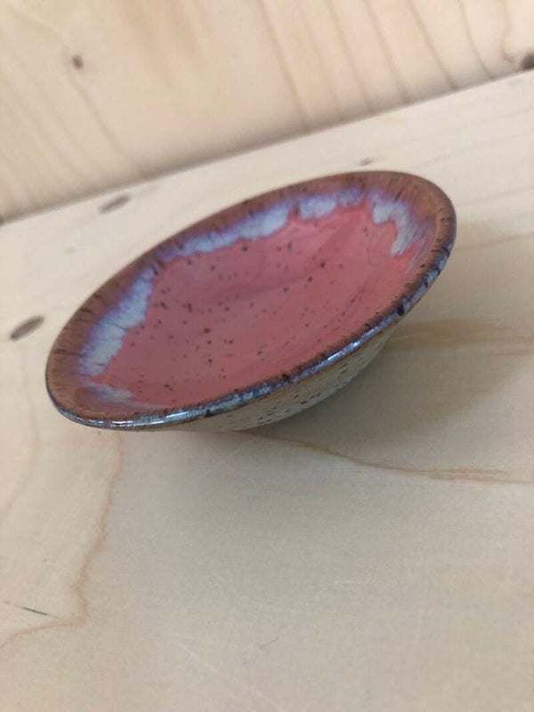 De binnenkant van dit met spikkelklei gedraaide schaaltje is roze geglazuurd met crème/lila accenten. De buitenkant is niet geglazuurd.
