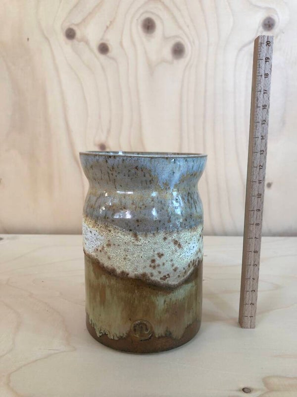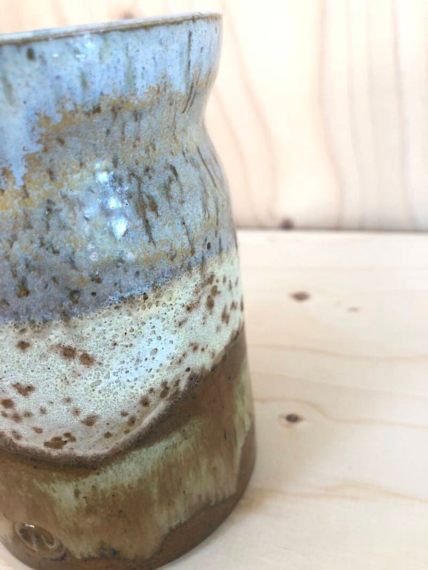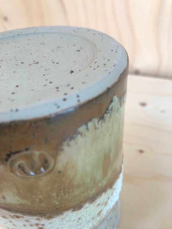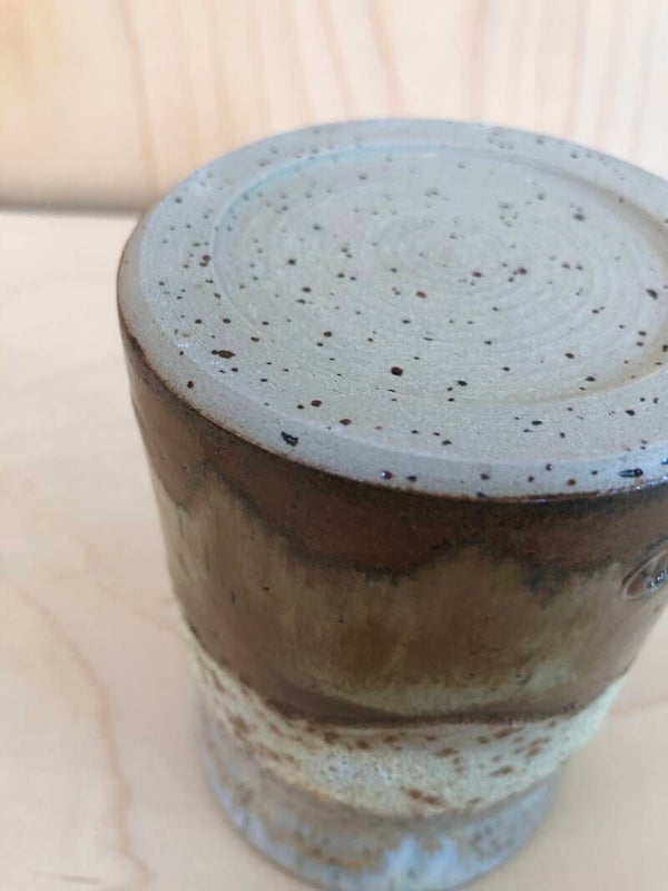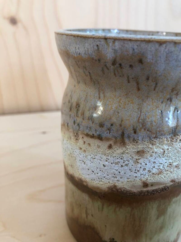 Dit vaasje heeft een retro vibe door het 70's kleurgebruik. Roestbruin/crème. In het midden een "vulcanisch" glazuur met een heel mooi reliëf.
