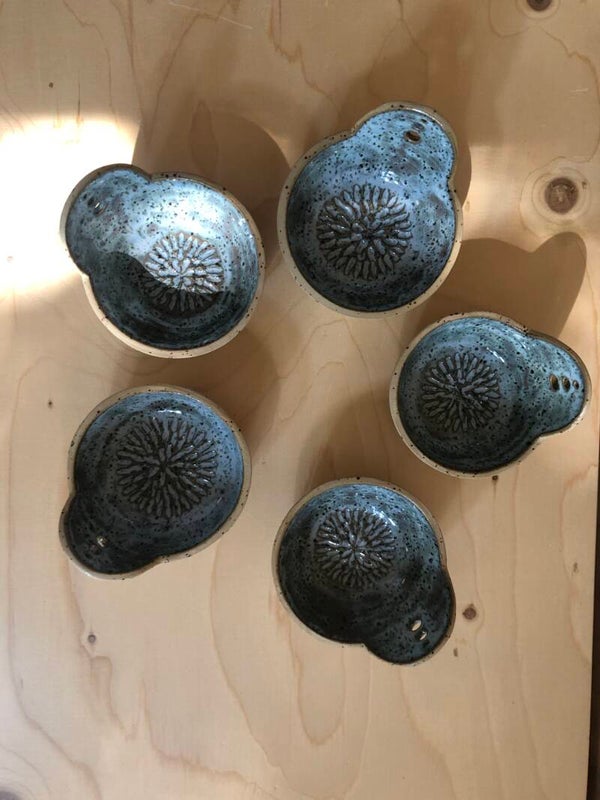 De gespikkelde kruidenstripper/knoflookrasp heeft een blauw glazuur. De buitenkant is niet geglazuurd.