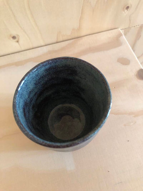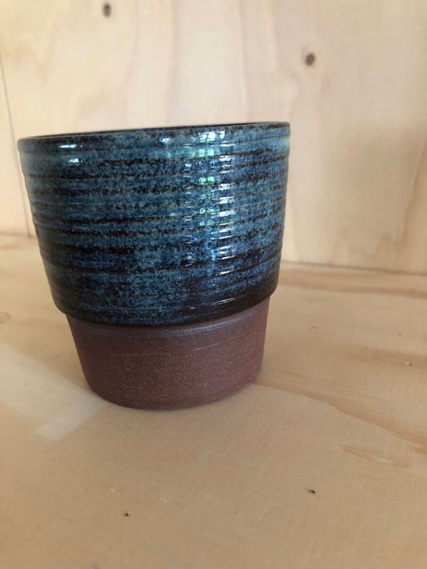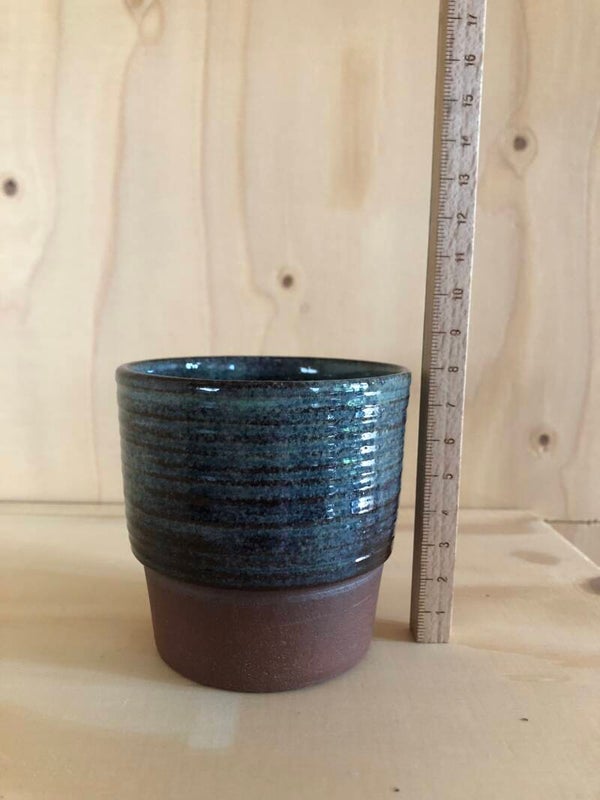 Deze mok is gedraaid met een bruinrood bakkende klei. Het glazuur is zeegroen.