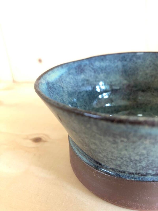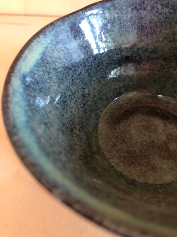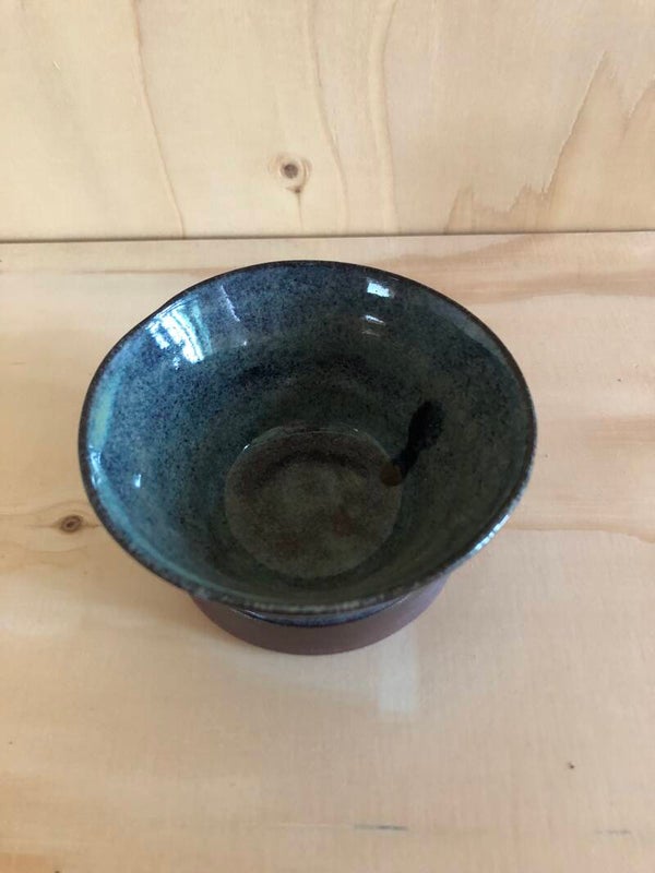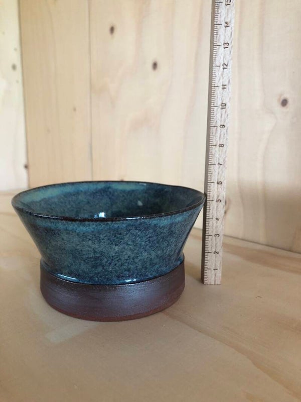 Dit bakje is gedraaid met een bruinrood bakkende klei. Het glazuur is zeegroen.