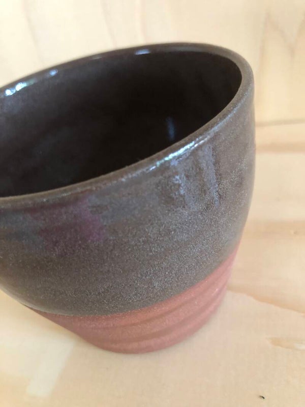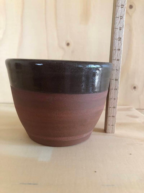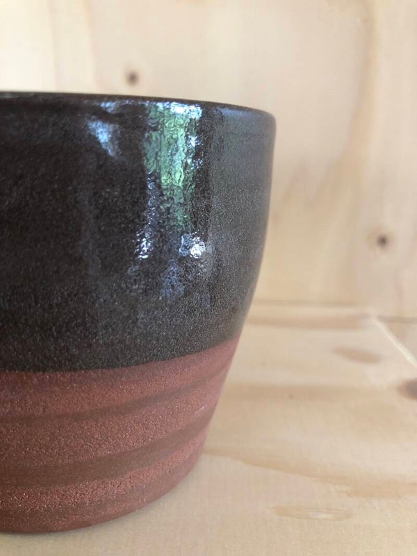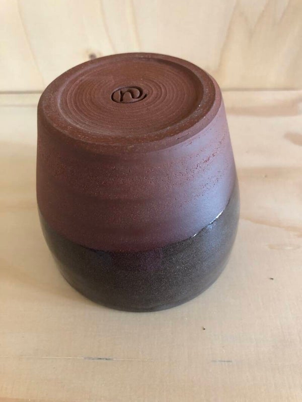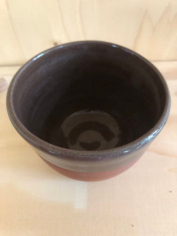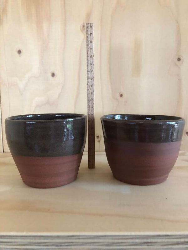 Deze mokken/bakjes zijn gedraaid met een bruinrood bakkende klei. Het glazuur is bruin.
