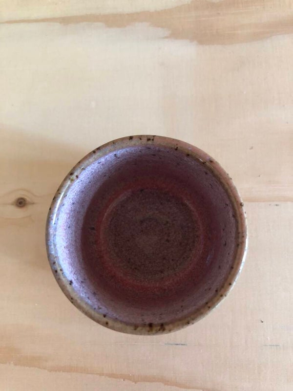Dit bakje is gedraaid met een spikkelklei. Het glazuur is roze met bruine accenten.