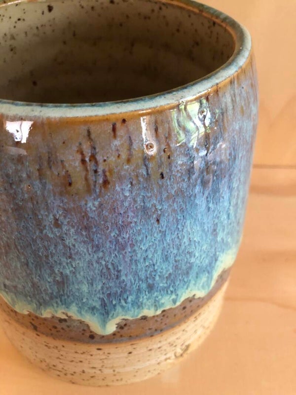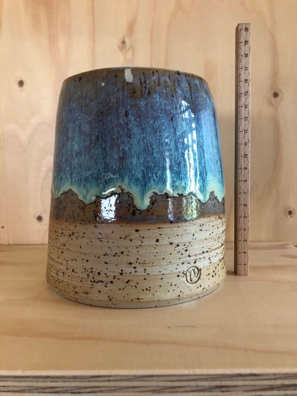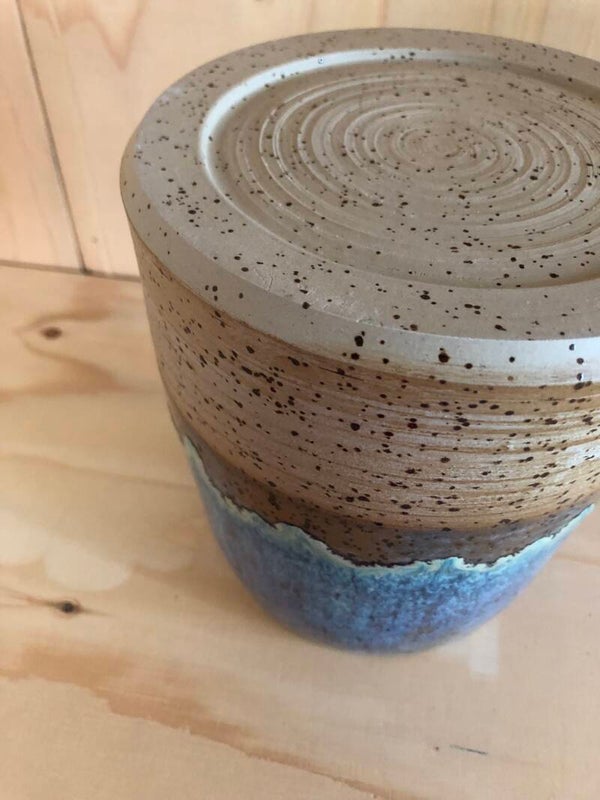 Deze vaas is gedraaid met spikkelklei. De binnenkant heeft een transparant glazuur. De buitenkant is aan de onderkant niet geglazuurd. De bovenkant heeft een glazuur met bruin-, blauw- en groentinten.