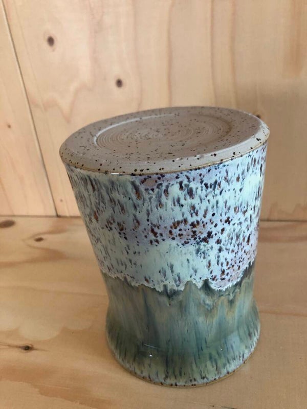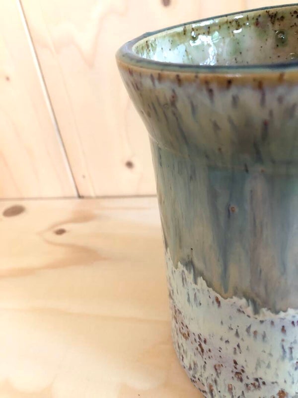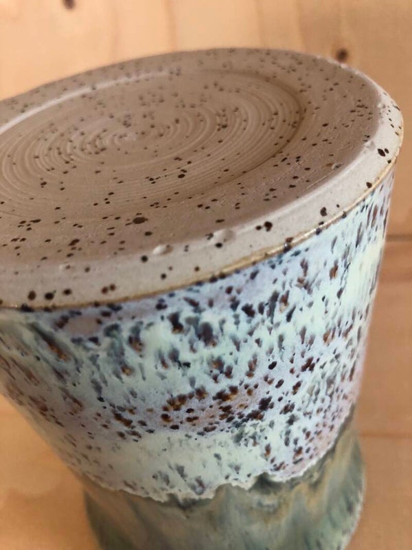 Deze vaas is gedraaid met spikkelklei. De binnenkant heeft een transparant glazuur met groene strepen. De buitenkant heeft een glazuur met (licht)bruin-, blauw- en groentinten.