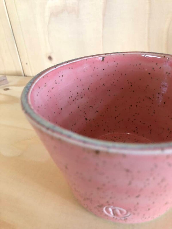 De binnen- en buitenkant van dit met spikkelklei gedraaide bakje is roze geglazuurd met crème accenten.