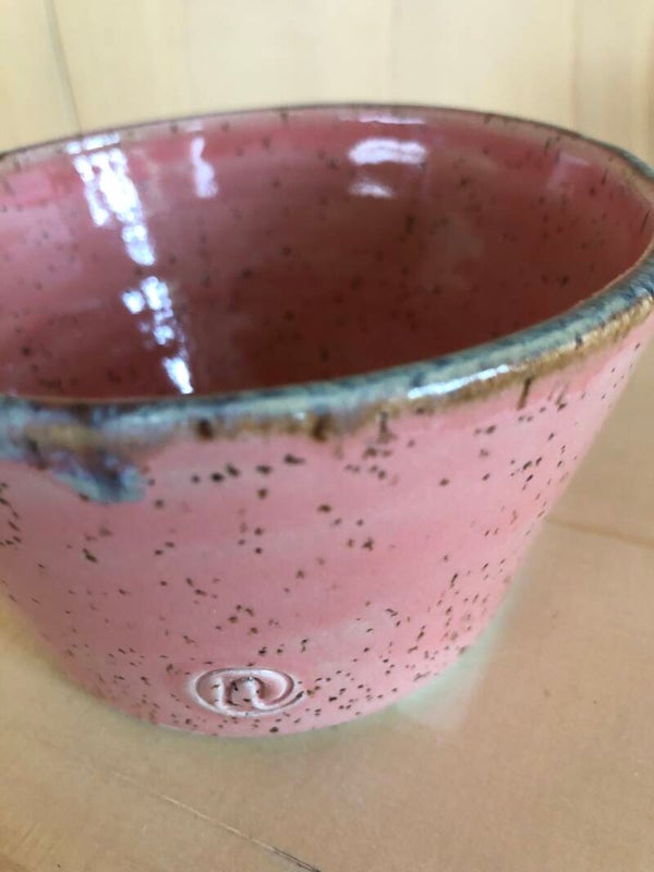De binnen- en buitenkant van dit met spikkelklei gedraaide bakje is roze geglazuurd met crème accenten.