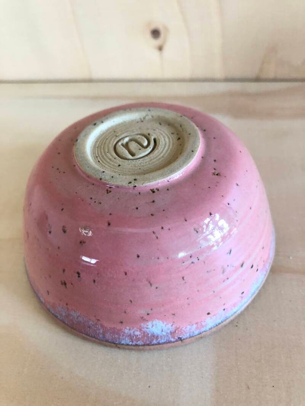 De binnen- en buitenkant van dit met spikkelklei gedraaide bakje is roze geglazuurd met crème/lila accenten.